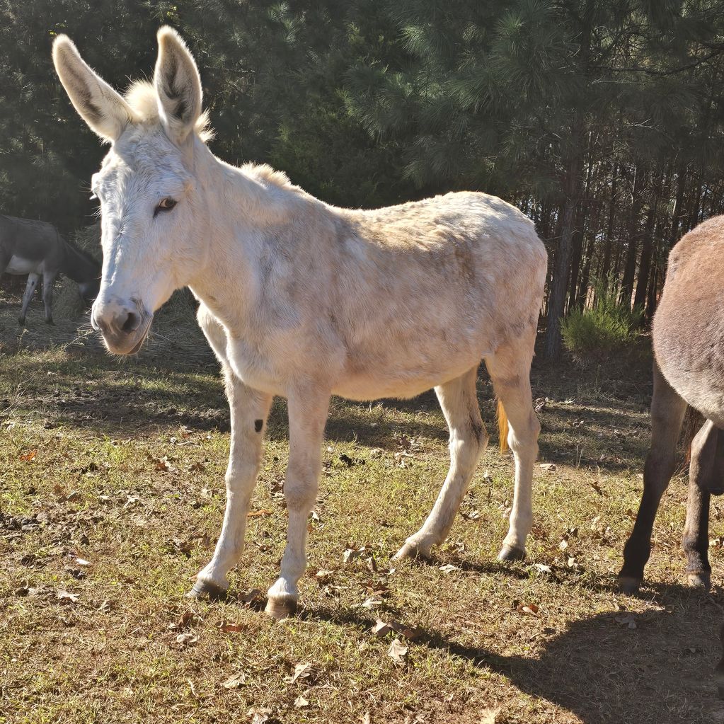 Older jenny around 20-24 yrs id say. She is the Sweetest donkey we have! Just needs feet trimmed not lame not foundered or anything. We let nature break them off a bit then get farrier to them. She had same owner 10 years living beside commercial chicken houses. She had sores all over from flies and mites/lice! She had round bald spots all over her body and her legs were raw from the flies. Now sh